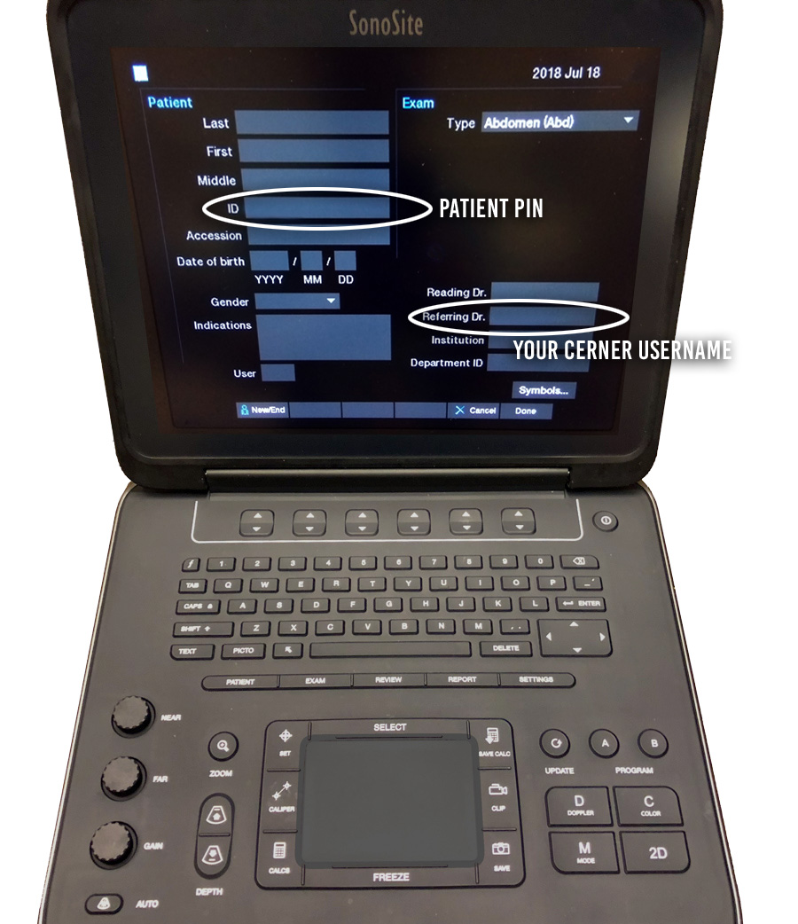 2 Enter patient PIN under “ID“, and your Cerner username under “Referring Dr”. All other fields can be ignored. Press “Done“.